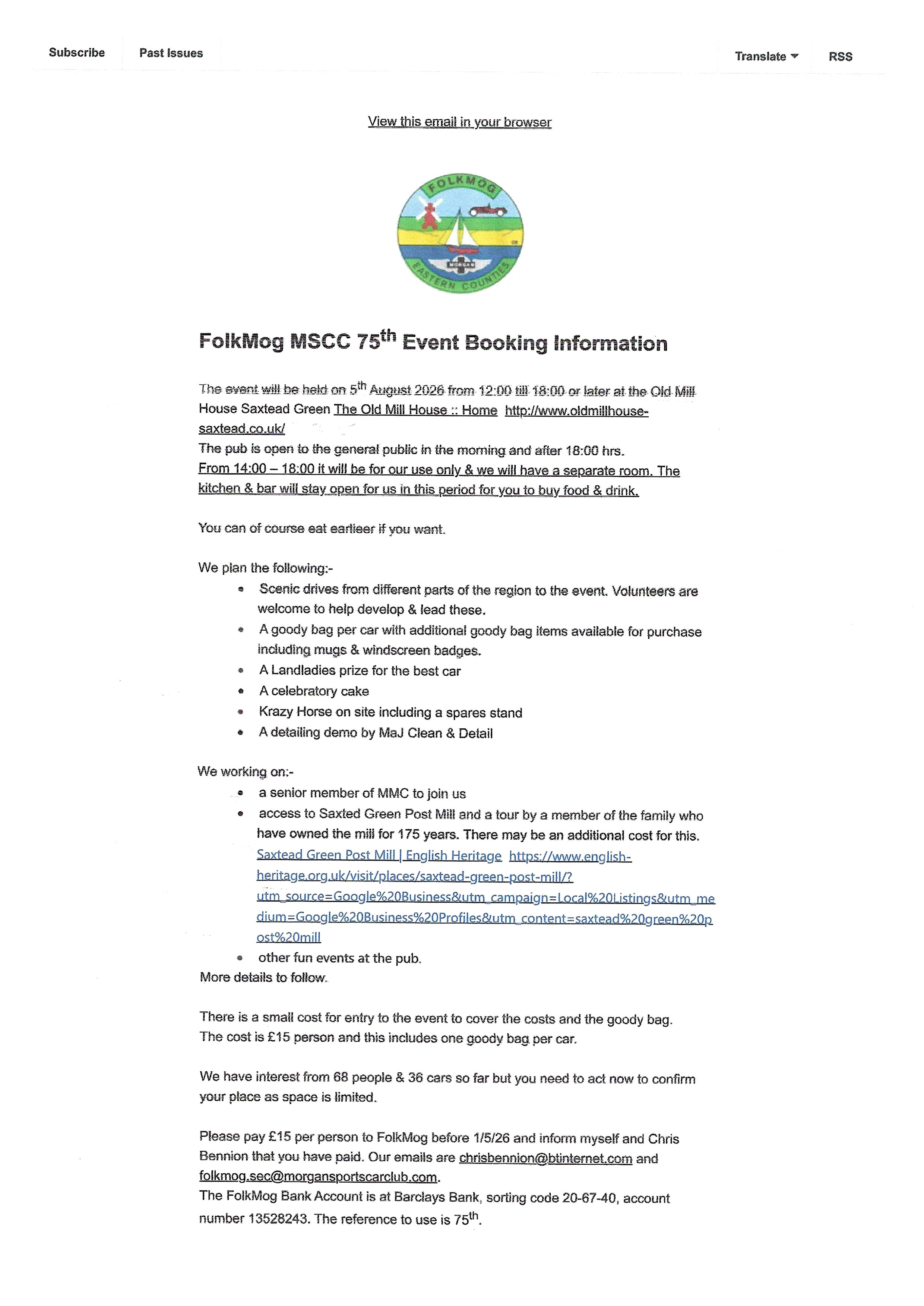 EVENT FULL BUT WAITING LIST OPERATING.The Folkmog MSCC 75th Anniversary event is to be held on Wednesday August 5th at The Old Mill House, Saxstead. Full details are shown below. Running from 12 noon to 18.00 hours, the venue will be open to the general public at lunch time, but will be for sole use from 14.00 to 18.00 hours. The cost is £15 per head which includes 1 goody bag per car. Please pay your £15 per head to the Folkmog account by May 1st. To book or for further information either use the form below or contact John Hayes who is organising the event.